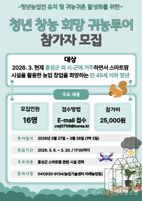 홍성군농업기술센터는 청년을 대상으로, 오는 27일부터 28일까지 1박 2일간 ‘청년 창농 희망 귀농투어’를 운영한다고 밝혔다.