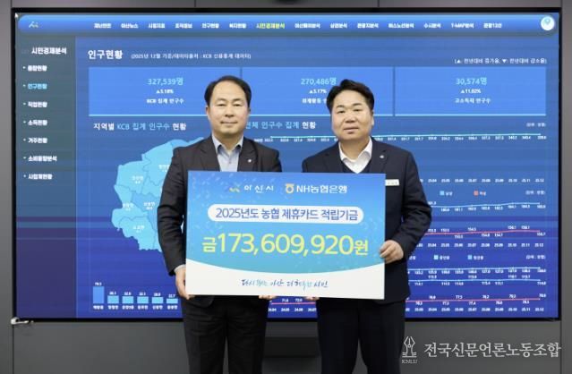 전국신문언론노동조합 강찬희 기자 | 아산시는 지난 6일 NH농협 아산시지부로부터 제휴카드 사용 적립기금 1억 7,360만 9,920원을 전달받았다.
