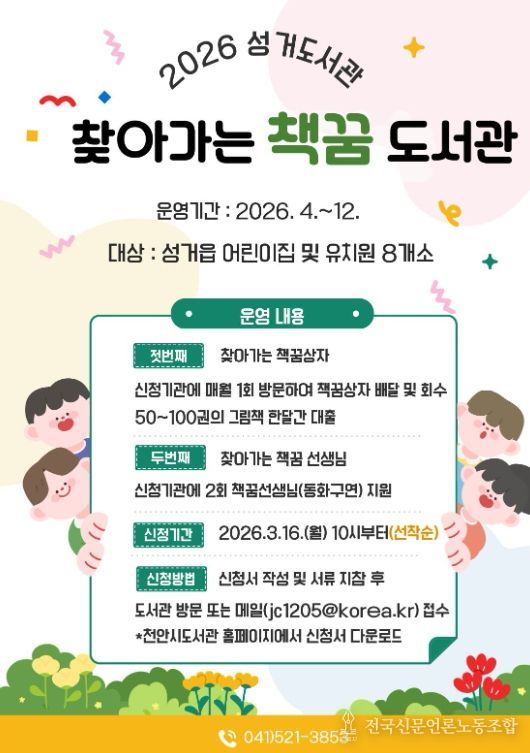 전국신문언론노동조합 강찬희 기자 | 천안시 성거도서관은 내달부터 ‘찾아가는 책꿈 도서관’을 운영한다고 9일 밝혔다.