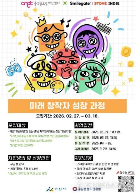 전국신문언론노동조합 강찬희 기자 | (재)충남콘텐츠진흥원 산하 충남글로벌게임센터가 아산시와 함께 ‘미래 창작자 양성 과정’ 참가자를 모집한다.