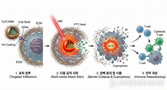 전국신문언론노동조합 강찬희 기자 | 전남대학교 의과대학 박인규 교수 연구팀이 난치성 암으로 꼽히는 '삼중음성 유방암(TNBC)'을 획기적으로 치료할 수 있는 다기능성 혁신 나노 전달체(CuP-HAM)를 개발하는 데 성공했다.