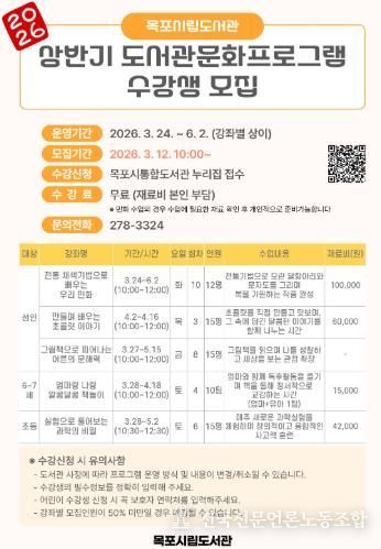 수강 신청은 3월 12일부터 목포시통합도서관 누리집을 통해 선착순으로 접수하며, 목포 및 인근 지역 주민이면 누구나 참여할 수 있다.