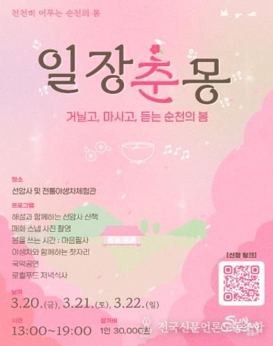 전국신문언론노동조합 강찬희 기자 | 순천시는 봄꽃이 피어나는 시기에 맞춰, 천년 고찰의 정취 속에서 휴식과 사색을 즐기는 프리미엄 감성 프로그램 ‘일장춘몽(一場春夢)’을 운영하고 참가자를 모집한다고 밝혔다.