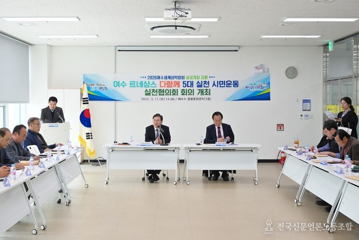 전국신문언론노동조합 강찬희 기자 | 여수시는 지난 11일 생활문화센터에서 ‘여수 르네상스 다함께 5대 실천 시민운동’ 실천협의회 2026년 첫 정기회의를 개최하고 2026여수세계섬박람회 성공개최를 위한 시민 참여 확대 방안을 논의했다고 밝혔다.