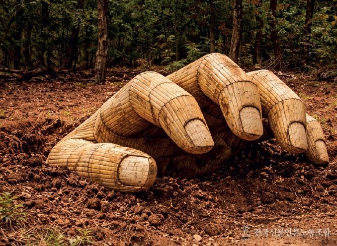 땅에서 솟아오르는 거대한 대나무 손은 인간의 고된 노동이 숭고한 생명 지탱의 몸짓으로 승화되는 상호성의 제스처를 상징하며, 대지가 살아있는 변형의 주체임을 시사한다.