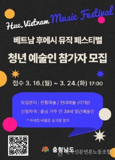 전국신문언론노동조합 강찬희 기자 | 충남도는 도내 역량 있는 청년 예술인들의 글로벌 무대 진출을 지원하기 위해 ‘2026 베트남 후에 뮤직 페스티벌’에 참가할 파견 공연단을 공개 모집한다고 23일 밝혔다.