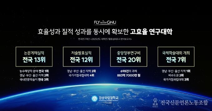 전국신문언론노동조합 강찬희 기자 | 경상국립대학교가 한국연구재단이 발간한 〈2025 대학연구활동실태조사 분석보고서〉에서 논문 실적과 연구 성과 전반에 걸쳐 전국 상위권을 기록하며 연구중심 국립대학으로서 위상을 강하게 입증했다.