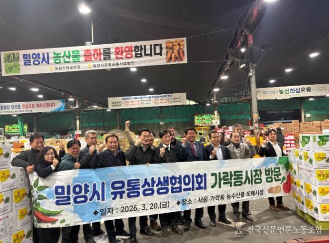 전국신문언론노동조합 강찬희 기자 | 밀양시 농산물 유통상생협의회는 지난 20일 서울 가락농수산물종합도매시장을 방문해 지역 농산물 유통 경쟁력 강화를 위한 현장 활동을 펼쳤다.