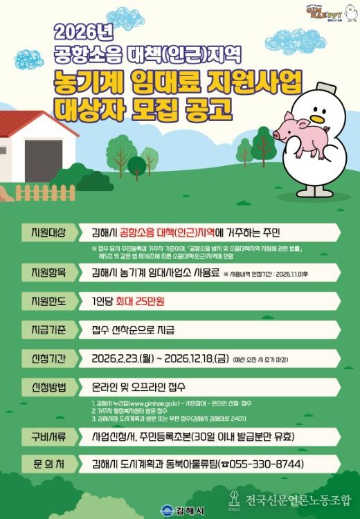 이 사업은 2026년 1월 1일 이후 김해시 농기계 임대사업소를 이용하고 납부한 임대료를 지원하는 것으로, 올해 개인별 지원 한도는 전년 대비 10만원 상향돼 농업인의 실질적인 경영비 절감효과가 기대된다.