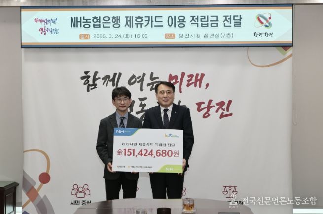 전국신문언론노동조합 강찬희 기자 | 당진시는 지난 24일 당진시청 접견실에서 시 금고인 NH농협은행(주) 당진시지부로부터 제휴카드 이용 적립금 151,424,680원을 전달받았다고 25일 밝혔다.