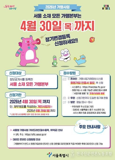 전국신문언론노동조합 강찬희 기자 | 서울시는 서울시에 등록된 모든 프랜차이즈 가맹본부는 4월 30일까지 2025년 사업내용을 반영한 ‘가맹사업 정보공개서 정기 변경등록’ 신청을 완료해야 한다고 밝혔다. 아울러 시는 가맹본부의 변경등록 지원을 위해 3월 26일 온라인 설명회를 개최할 예정이다.