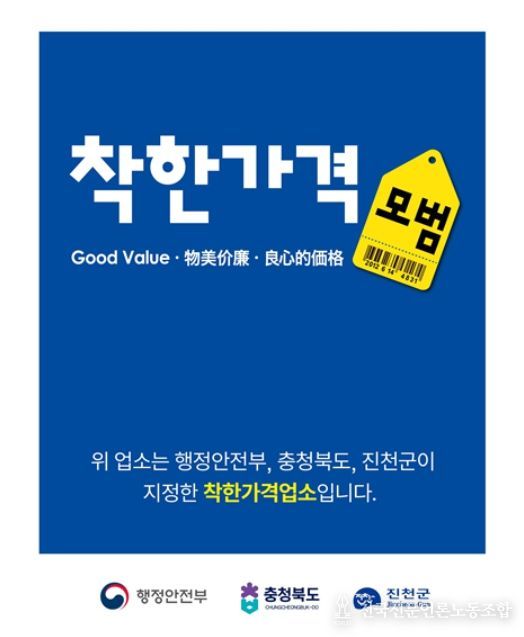 전국신문언론노동조합 김성길 기자 | 진천군은 4월 15일까지 2026년 신규 착한가격업소를 모집한다고 25일 밝혔다.