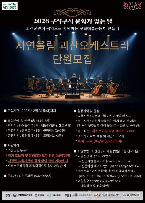 전국신문언론노동조합 김성길 기자 | 충북 괴산문화원은 문화체육관광부와 충청북도, 괴산군이 후원하는 2026년 ‘구석구석 문화가 있는 날’ 사업과 연계해 ‘자연울림 괴산오케스트라’를 창단하고 함께할 단원을 모집한다고 27일 밝혔다.