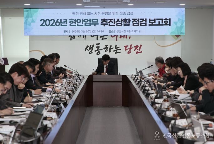 전국신문언론노동조합 강찬희 기자 | 당진시는 지난 30일 당진시청 7층 소회의실에서 당진시장 권한대행 황침현 부시장 주재로 국·소장 및 각 부서장들이 참석한 가운데 2026년 현안업무 추진상황 점검 보고회를 개최했다고 31일 밝혔다.