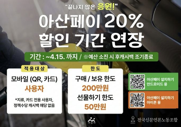 전국신문언론노동조합 강찬희 기자 | 아산시가 중동 위기 장기화에 대응해 아산페이 20% 특별할인 기간을 한시 연장한다. 국제 유가 상승과 물가 불안이 이어지는 상황에서 서민 가계 부담을 완화하고 지역 소비를 유지하기 위한 조치다.
