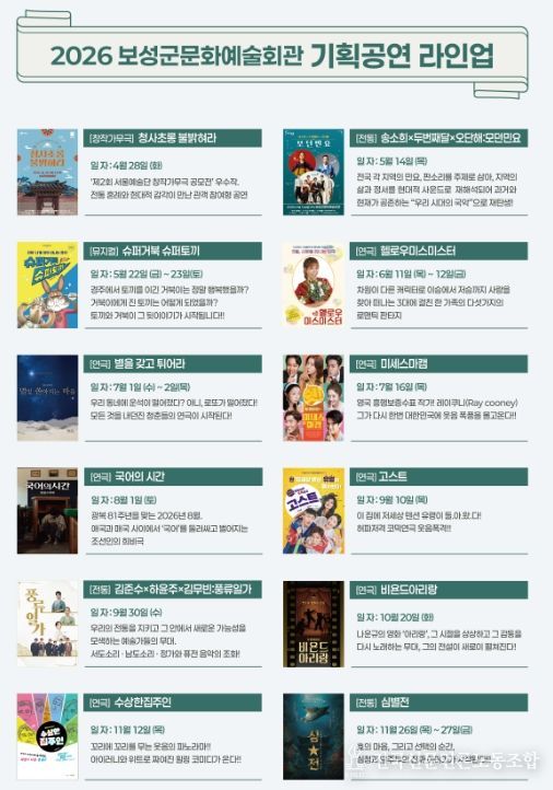 공연별 티켓 예매 일정과 세부 프로그램은 추후 ‘보성군문화예술회관 누리집을 통해 안내된다.