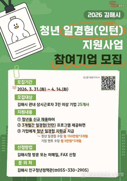 전국신문언론노동조합 강찬희 기자 | 김해시는 미취업 청년에게 기업 직무 경험 기회를 제공하는 청년 일경험(인턴) 지원사업 참여기업을 모집한다고 1일 밝혔다.
