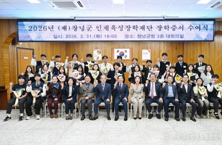 전국신문언론노동조합 강찬희 기자 | (재)창녕군인재육성장학재단은 31일, 2026년 장학증서 수여식을 개최했다. 이날 수여식에는 부문별 장학생 대표 33명을 비롯해 교사와 학부모 등 50여 명이 참석해 뜻깊은 시간을 함께했다.