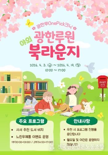 전국신문언론노동조합 강찬희 기자 | 남원어울림도서관은 오는 4월 3일부터 19일까지 광한루원 정문 잔디마당에서 2026년 상반기 '광한루원 야외 북라운지'를 운영한다고 밝혔다.