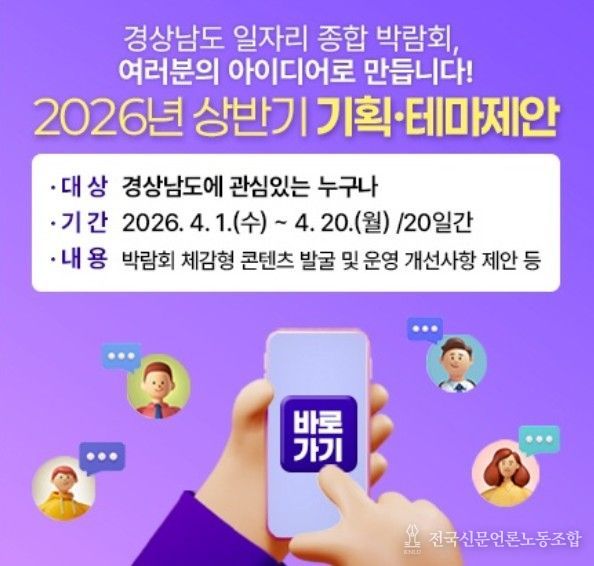 경남도는 첫 번째 공모 주제로 오는 9월 개최 예정인 ‘경남 일자리 종합 박람회’를 선정했다. 신규 콘텐츠 발굴은 물론 기존 박람회 운영 과정에서의 불편 사항 개선까지 등 수요자가 직접 체감한 다양한 제안을 수렴해, 박람회 기획 단계부터 적극 반영할 계획이다.