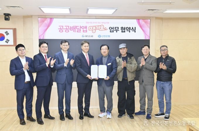 전국신문언론노동조합 김성길 기자 | 하남시는 3월 31일 시청 본관 2층 상황실에서 신한은행과 공공배달앱 ‘땡겨요’ 운영을 위한 업무협약을 체결하고, 전통시장 온라인 판로 확대에 본격 나섰다고 밝혔다.