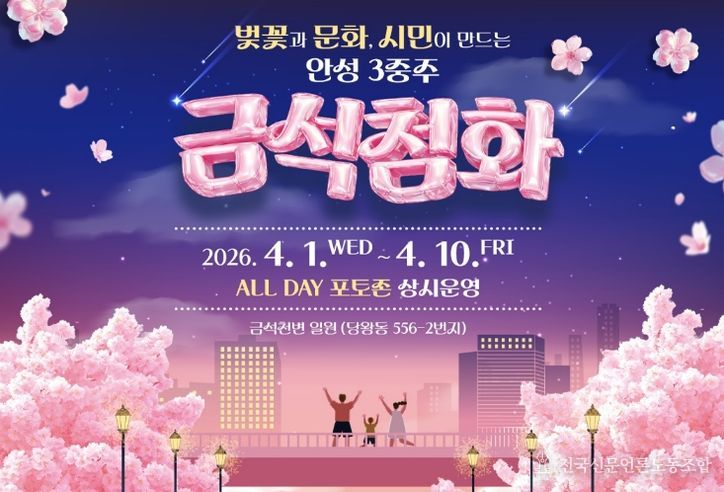 전국신문언론노동조합 김성길 기자 | 안성시 안성3동은 벚꽃이 절정을 이루는 개화기를 맞아 오는 4월1일부터 10일까지 열흘간 금석천변 일원(대덕농협 하나로마트~ 비룡초등학교 꿈의 다리)에서 ‘금석첨화’ 벚꽃 포토존을 운영한다고 밝혔다.