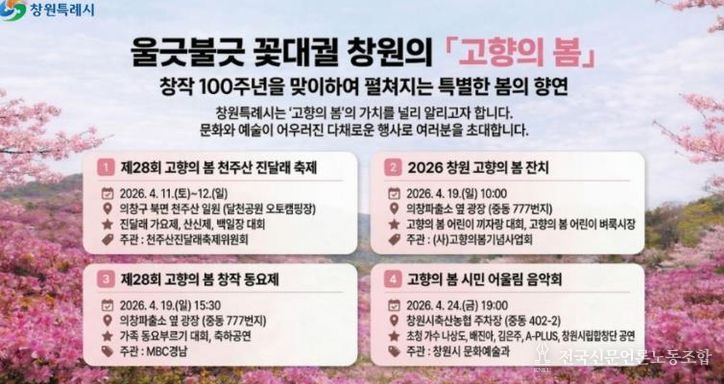 전국신문언론노동조합 강찬희 기자 | 창원특례시는 4월, '고향의 봄'을 주제로 한 다채로운 문화예술 행사를 개최한다고 밝혔다.