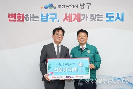 전국신문언론노동조합 이의용 기자 | 지난 30일, BNK부산은행(BNK금융그룹희망나눔재단)에서는 부산광역시 남구(구청장 오은택)에 시원한 여름나기 사업의 목적으로 선풍기 150대 (1,200만 원 상당)을 전달했다.