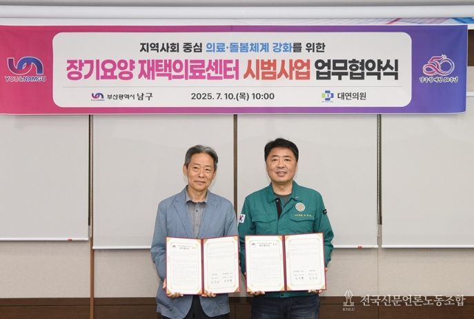 전국신문언론노동조합 이의용 기자 | 부산광역시 남구청은 지난 10일 보건복지부 주관 ‘2025년 장기 요양 재택의료 센터 시범 사업’에 선정되어, 관내 대연의원과 협약을 체결하고 재택 의료서비스 제공에 나섰다.
