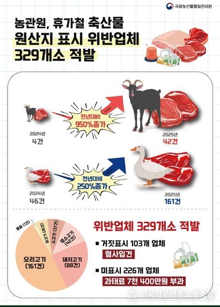 점검 결과 위반업체는 329개소를 적발했으며, 위반품목은 오리고기 161건(45.4%), 돼지고기 88건(24.8%), 염소고기 42건(11.8%), 소고기 37건(10.4%), 닭고기 26건(7.3%), 벌꿀 1건(0.3%) 순으로 나타났다.