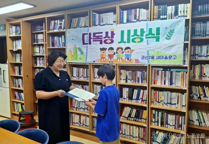 전국신문언론노동조합 기자 | 수원시 권선구 권선2동 새마을문고에서는 지난 27일 여름방학 기간 동안 책을 가장 많이 읽은 문고 이용자를 선정하여 ‘다독상 시상식’을 개최했다.