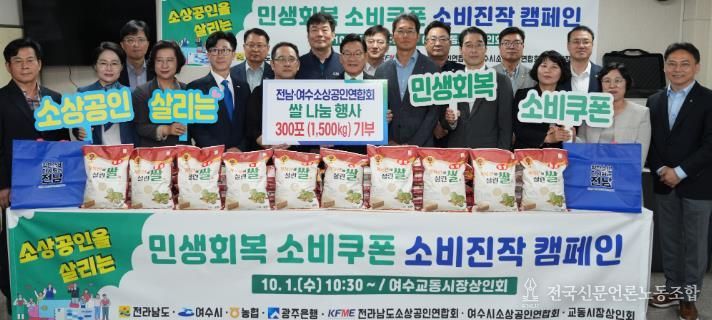 전국신문언론노동조합 김성길 기자 | 전라남도와 전남도 소상공인연합회는 1일 여수 교동시장에서 농협과 광주은행으로부터 기부받은 쌀(5kg) 300포를 활용해 지역민과 함께 나누는 ‘민생회복 소비쿠폰 소비 진작 캠페인’을 개최했다고 밝혔다.