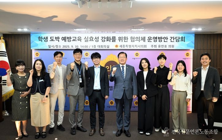 전국신문언론노동조합 강찬희 기자 | 유인호 세종시의회 의원(더불어민주당, 교육안전위원회 소속)은 지난 30일 세종시의회 1층 대회의실에서 ‘학생 도박 예방 교육 실효성 강화를 위한 협의체 운영 방안’을 논의하는 간담회를 열었다. 간담회에는 세종시교육청 학교정책 담당자, 세종경찰청, 세종충북 도박 문제 예방 치유센터 관계자와 세종시 학부모 대표들이 참석했다.