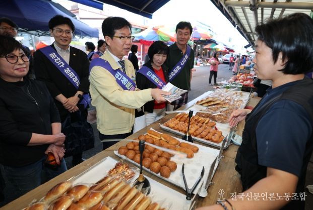 전국신문언론노동조합 강찬희 기자 | 박병규 광산구청장과 광산구 공직자들이 1일 송정매일시장에서 추석 맞이 명절 장보기 행사를 진행했다.