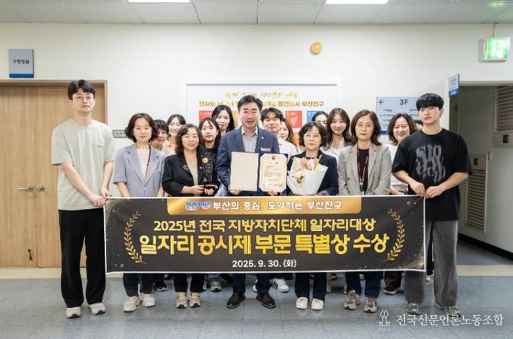 전국신문언론노동조합 이의용 기자 | 부산 부산진구가 고용노동부 주관 ‘2025 전국 지방자치단체 일자리대상’ 지역일자리 목표 공시제 부문에서 특별상을 수상했다고 밝혔다.