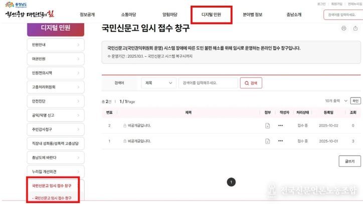 전국신문언론노동조합 강찬희 기자 | 충남도는 2일부터 도 누리집에 ‘국민신문고 온라인 임시 접수 창구’를 개설·운영하고 있다고 밝혔다.
