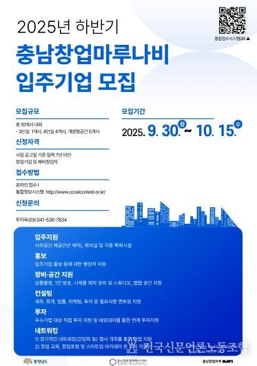 전국신문언론노동조합 강찬희 기자 | (재)충남창조경제혁신센터는 오는 10월 15일까지 2025년 하반기 충남창업마루나비 입주기업을 모집한다고 밝혔다. 이번 모집은 혁신적인 아이디어와 성장 잠재력을 지닌 스타트업을 발굴해 안정적인 보육 환경을 제공하고, 기업의 지속적인 성장을 지원하기 위해 추진된다.