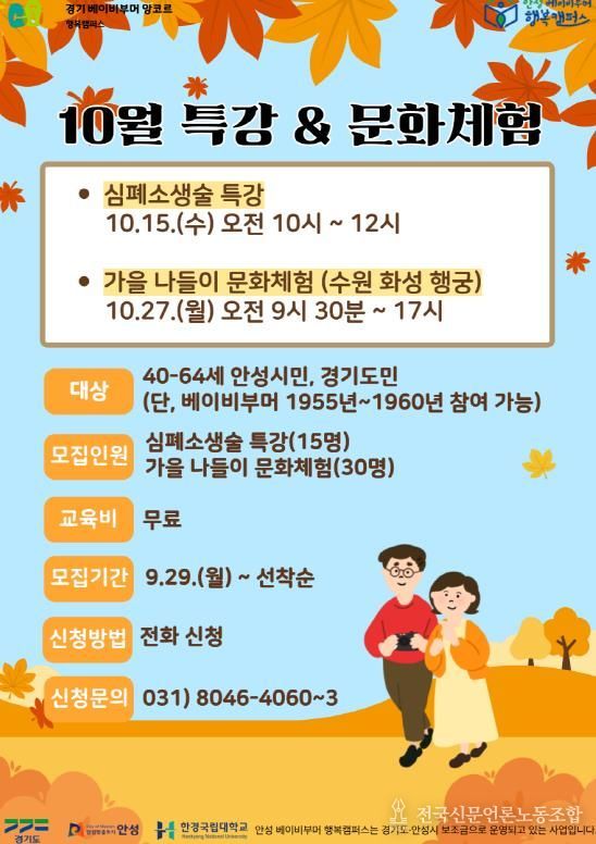 전국신문언론노동조합 기자 | 안성 베이비부머 행복캠퍼스(한경국립대학교 평생교육원)는 오는 10월 15일부터 27일까지 중장년 안성시민(경기도민)을 대상으로 ‘10월 특강(심폐소생술) 및 문화체험(수원화성행궁)’ 프로그램을 운영한다고 밝혔다.