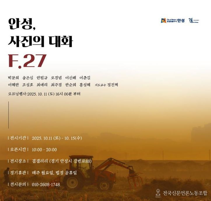 전국신문언론노동조합 기자 | 안성시 사진동아리 F.27 photo가 오는 10월 11일부터 15일까지 안성천 작은미술관 결갤러리에서 전시회 ‘안성, 사진의 대화 F.27’을 개최한다. 이번 전시는 동아리 회원 18명이 참여해 안성의 자연환경과 사람들의 이야기를 기록한 작품을 선보인다.