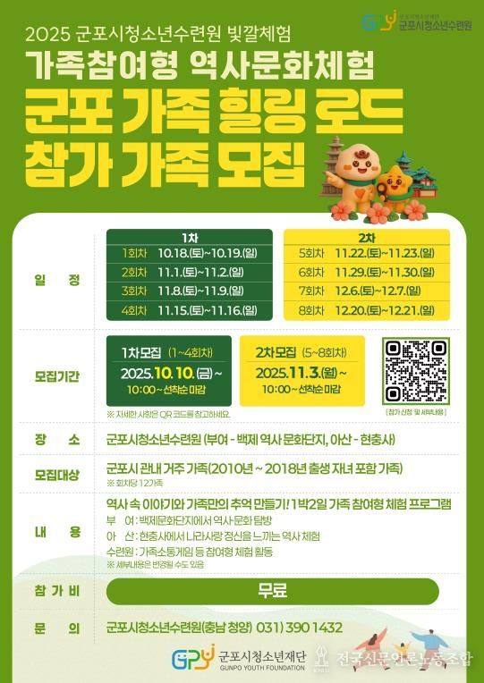 전국신문언론노동조합 기자 | 군포시청소년재단이 운영하는 군포시청소년수련원(충남 청양)은 관내 가족을 대상으로 2025년 가족참여형 역사문화탐방 '군포가족 힐링로드' 참가자를 모집한다.