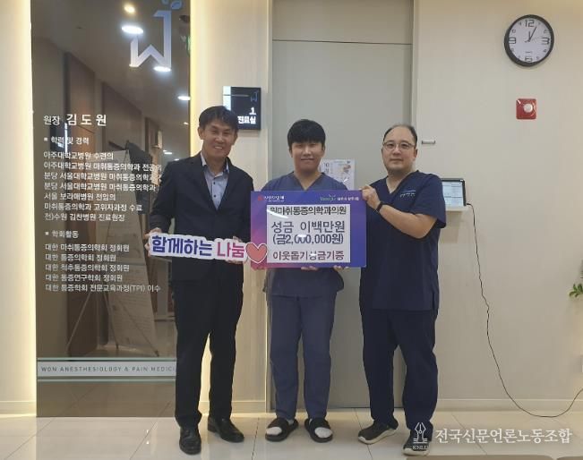 전국신문언론노동조합 기자 | 양주시 양주2동이 지난 1일 관내 원마취통증의학과의원에서 추석을 맞이하여 이웃돕기 성금 200만 원을 양주2동에 기탁했다고 밝혔다.