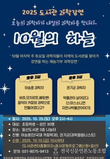 전국신문언론노동조합 기자 | 고양특례시 일산도서관에서는 과학자들의 재능기부 도서관 과학 강연프로그램 ‘10월의 하늘’을 운영한다.