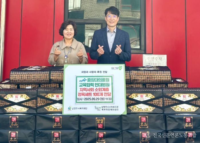 전국신문언론노동조합 기자 | 남양주시는 지난달 29일 진접읍에 위치한 중앙대의료원 교육협력 현대병원이 추석을 앞두고 1,000만 원 상당의 정육세트 100개를 북부희망케어센터에 전달했다고 2일 밝혔다.