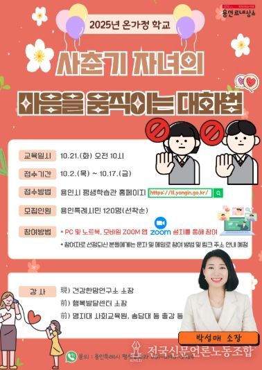 전국신문언론노동조합 기자 | 용인특례시는 ‘사춘기 자녀 마음을 움직이는 대화법’을 주제로 한 ‘2025년 온가정 학교’ 온라인 특강 참가자를 모집한다고 2일 밝혔다.