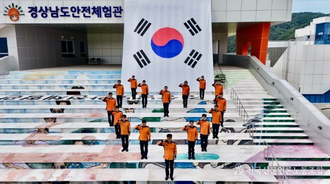 전국신문언론노동조합 강찬희 기자 | 경상남도 소방본부은 제4357주년 개천절을 맞아, 10월 2일부터 3일까지 이틀간 경상남도 안전체험관 부지 내에 대형 태극기를 게양하고, 체험관 전 직원이 함께 기념 촬영을 진행했다고 밝혔다.