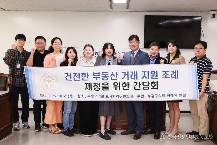 전국신문언론노동조합 강찬희 기자 | 인천 부평구의회 정예지 의원(더불어민주당 비례)은 지난 10월 2일 부평구의회 도시환경위원회실에서 '인천광역시부평구 건전한 부동산 거래 지원 조례'제정을 위한 간담회를 개최했다.