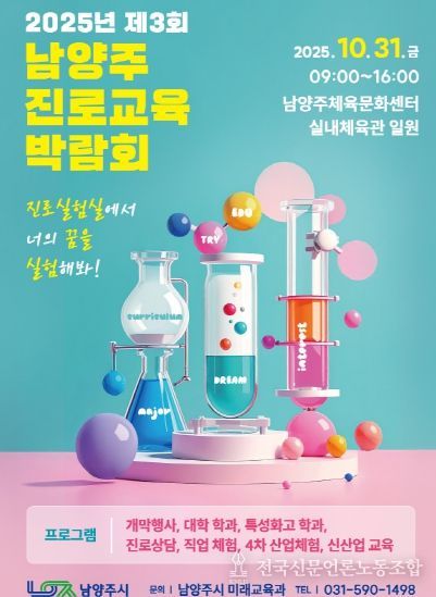 전국신문언론노동조합 기자 | 남양주시는 오는 31일 남양주체육문화센터 실내체육관에서 청소년과 학부모를 대상으로 ‘2025년 제3회 남양주 진로교육박람회’를 개최한다고 2일 밝혔다.