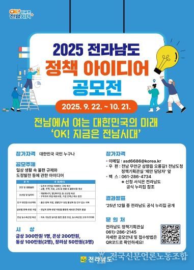 전국신문언론노동조합 김성길 기자 | 전라남도가 새 정부의 실용주의 기조에 맞춰 ‘생활 속 불편을 찾고 이를 개선할, 지역의 미래를 먹여 살릴 정책’을 주제로 ‘2025년 전라남도 정책 아이디어 공모전’을 개최한다.
