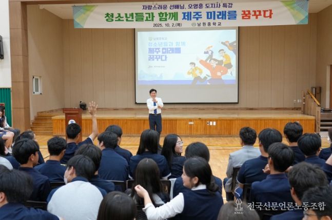 전국신문언론노동조합 김성길 기자 | 오영훈 제주특별자치도지사는 2일 남원중학교(교장 오경석)를 찾아 전교생을 대상으로 특별강연을 열고, “남원과 제주를 넘어 아시아, 나아가 우주까지 여러분의 무대가 돼야 한다”며 청소년들의 꿈과 도전을 격려했다.