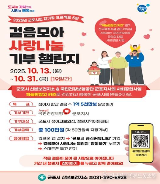 전국신문언론노동조합 기자 | 군포시 산본보건지소는 오는 10월 13일부터 31일까지(19일간) 국민건강보험공단 군포지사와 함께하는 '걸음모아 사랑나눔' 기부챌린지를 운영한다.